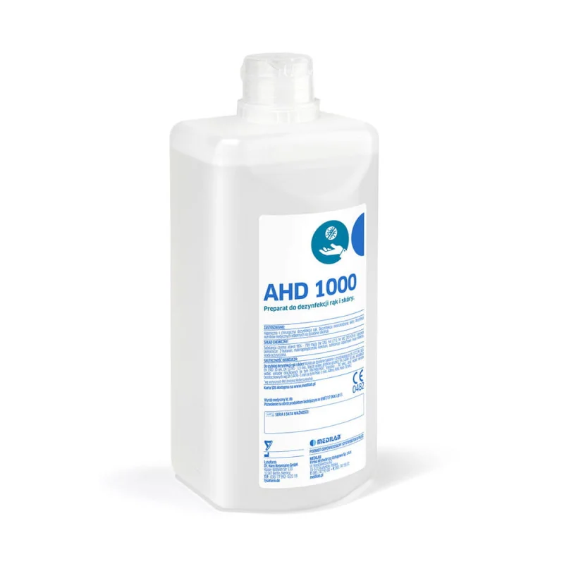 Alkoholowy preparat w płynie do higienicznej i chirurgicznej dezynfekcji rąk i skóry AHD 1000 w butelce 500ml to gotowy do użycia płyn do użytku profesjonalnego. Posiada potwierdzone badaniami szerokie spektrum biobójcze: bakteriobójcze, prątkobójcze, grzybobójcze, wirusobójcze (Polio, Adeno, Noro).