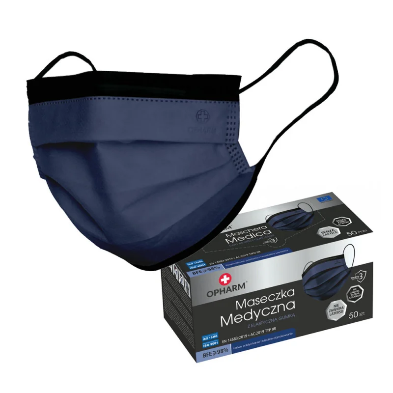 Trzywarstwowa, ciemno niebieska maseczka chirurgiczna, wykonana z włókniny meltblown, mocowana na elastycznych gumkach, chroniąca drogi oddechowe przed bakteriami i drobnoustrojami.