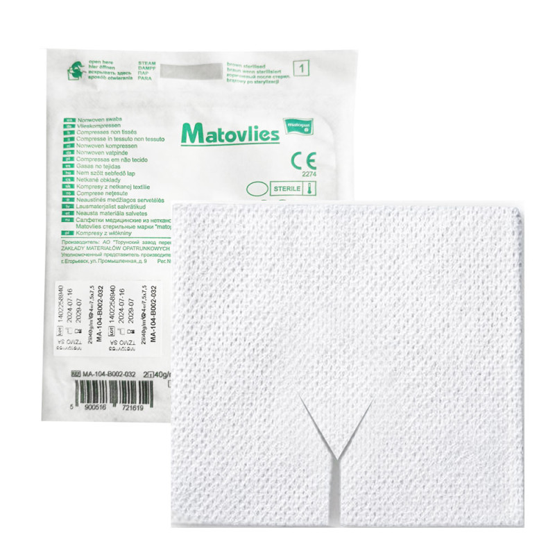 Kompresy tracheotomijne 7,5cm x 7,5cm - 4 szt - jałowe Matovlies z wycięciem Y stosowane są do zabezpieczania rurek tracheotomijnych, cewników oraz innych rodzajów wkłuć.