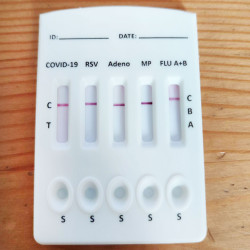 Szybki test do jakościowego wykrywania obecności SARS-COV-2, wirusa grypy typu A, wirusa grypy typu B wirusa RSV, adenowirusa (ADV), ludzkiego metapneumowirusa (hMPV), wirusa paragrypy (PIV) oraz rhinowirusa (RhV) metodą złota koloidalnego.