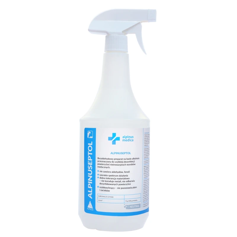 Alpinuseptol to gotowy do użycia płyn do dezynfekcji powierzchni i wyposażenia, przeznaczony do codziennego stosowania w placówkach medycznych oraz przestrzeniach wymagających wysokiego standardu higieny. Dostępny w poręcznej butelce 1 l ze spryskiwaczem do szybkiej aplikacji. Produkt jest wyróżniony jako wyrób medyczny i produkt biobójczy, co potwierdza jego skuteczność i bezpieczeństwo stosowania w obszarach o wysokich wymaganiach higienicznych.