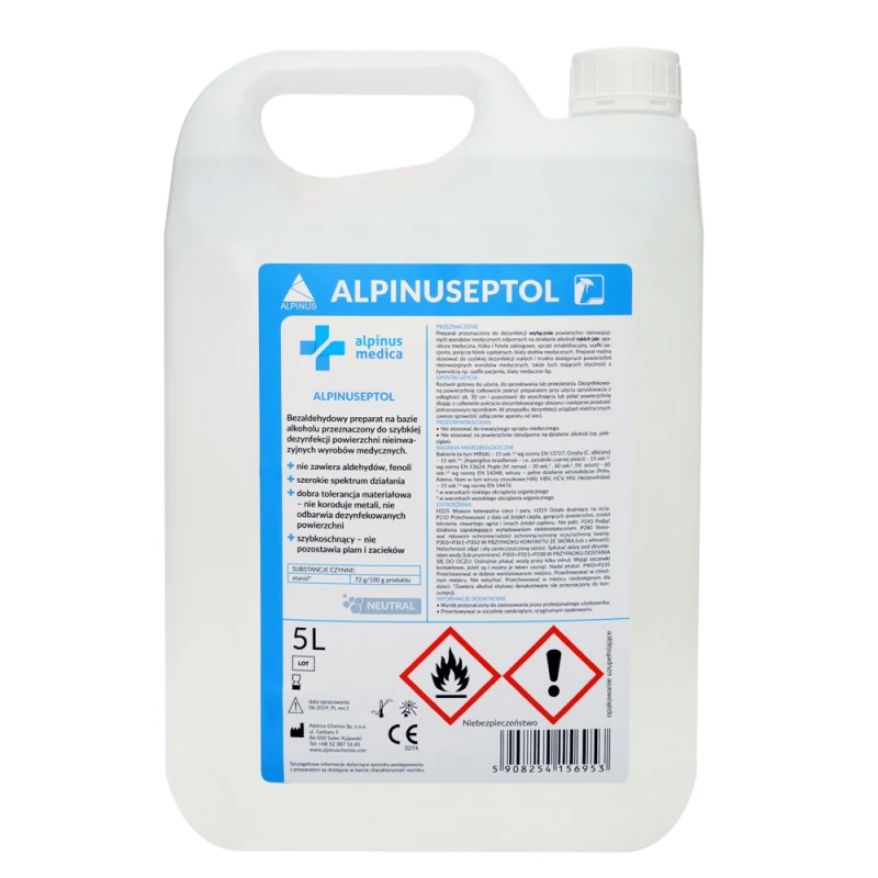 Alpinuseptol to gotowy do użycia płyn do dezynfekcji powierzchni i wyposażenia, przeznaczony do codziennego stosowania w placówkach medycznych oraz przestrzeniach wymagających wysokiego standardu higieny. Dostępny w ekonomicznym kanistrze 5l. Produkt jest wyróżniony jako wyrób medyczny i produkt biobójczy, co potwierdza jego skuteczność i bezpieczeństwo stosowania w obszarach o wysokich wymaganiach higienicznych.