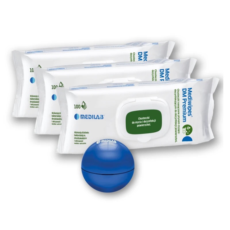 Zestaw 3 szt chusteczek Mediwipes DM Premium w wygodnym opakowaniu typu flowpack z pomadką gratis. Chusteczki przeznaczone są do dezynfekcji i mycia delikatnych powierzchni oraz różnego rodzaju wyposażenia. Preparat do użytku profesjonalnego.