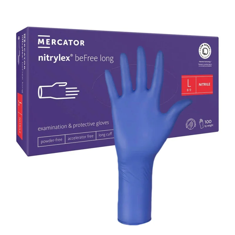 Rękawiczki nitrylowe nitrylex beFree long w rozmiarze L to wydłużone, bezpudrowe rękawice medyczne z mikro teksturą, zapewniające pewny chwyt i wysoki komfort pracy. Dzięki technologii Low Derma® oraz braku lateksu są bezpieczne nawet dla bardzo wrażliwej skóry i dopuszczone do kontaktu z żywnością.