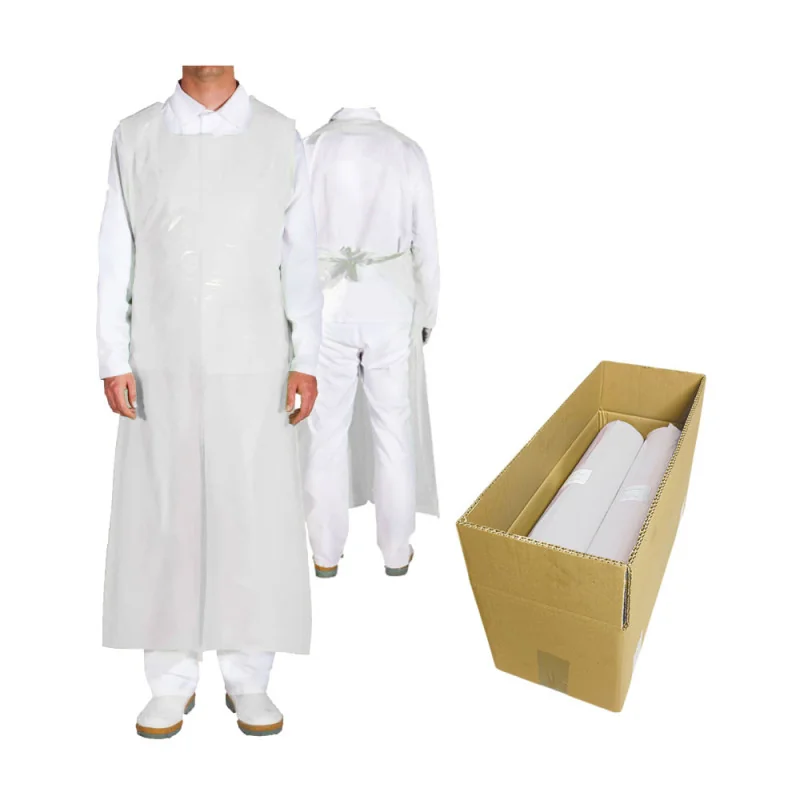 Uniwersalny fartuch nieprzemakalny w rozmiarze 90cm x 150cm w kolorze białym, grubszy - 45 mikronów, wiązany, do stosowania w przetwórstwie spożywczym, do laboratorium czy prac czyszczących. Fartuchy dostępne w opakowaniu zbiorczym po 200szt (50szt x 4op)